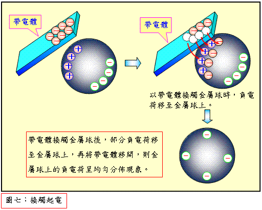 (1)步驟一:以帶有負(fù)電的帶電體靠近一電中性的金屬球,使金屬球產(chǎn)生靜電感應(yīng),(亦即正、負(fù)電荷分離)。