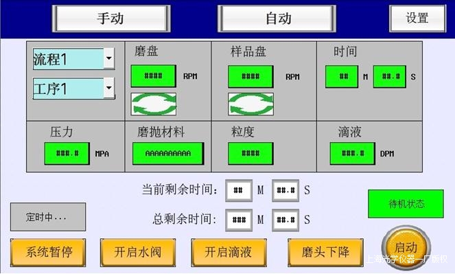 2) 單工序模式:根據(jù)每一步磨拋工序,可設(shè)置和調(diào)用30種工序參數(shù):磨盤(pán)和磨頭轉(zhuǎn)動(dòng)速度、磨拋時(shí)間、水通斷……